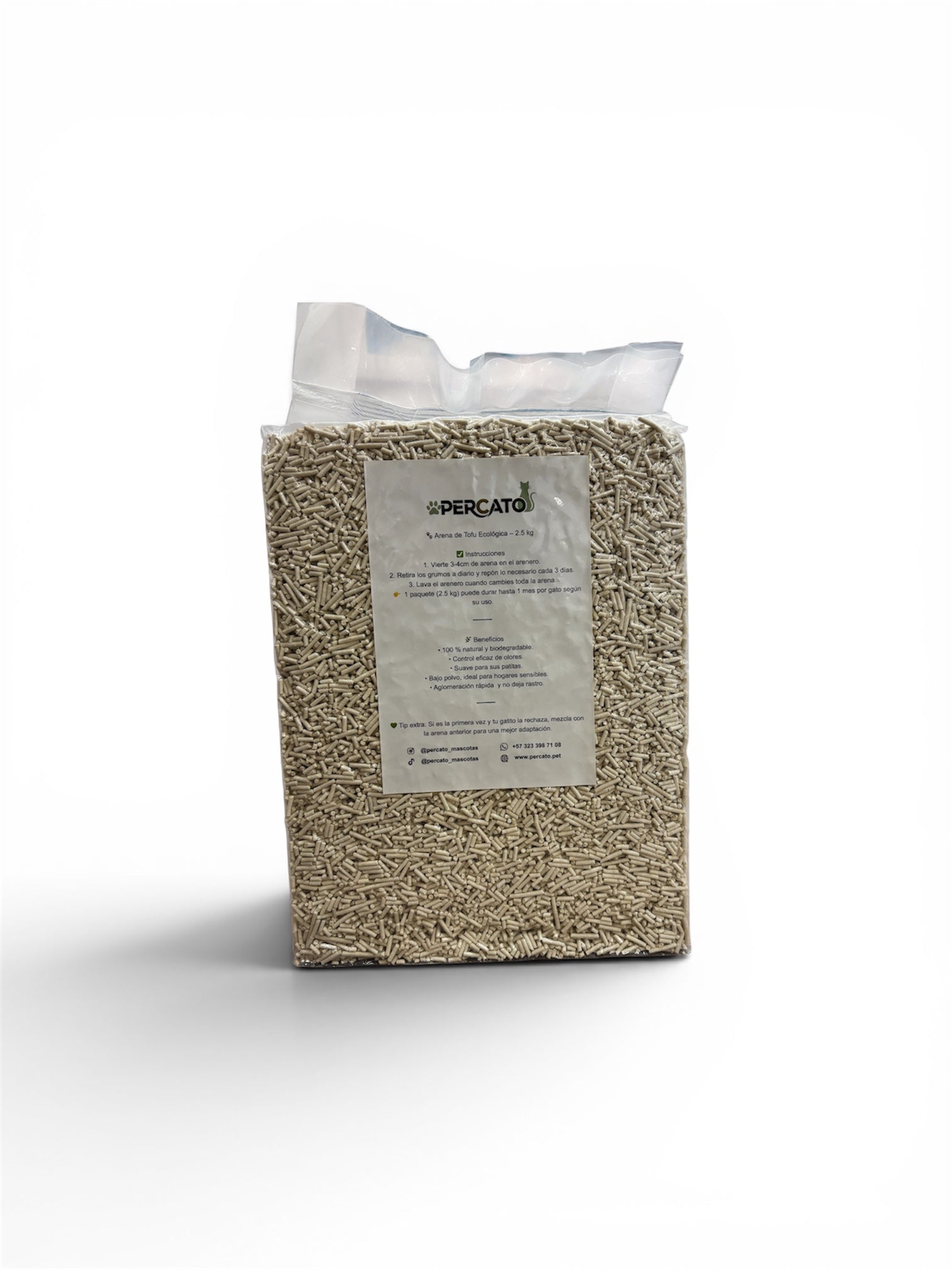 Las fibras vegetales de nuestra arena percato absorben el triple, con respecto a otras arenas, por eso con una bolsa de 2,5 kg es suficiente para el mes de un gato. 🐈
